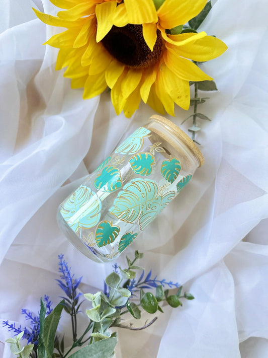 WHIMSICAL GLASS BEER CAN TUMBLER | UV DTF DESIGN | 16OZ BEER CAN CUP | GLASS TUMBLER | BAMBOO LID