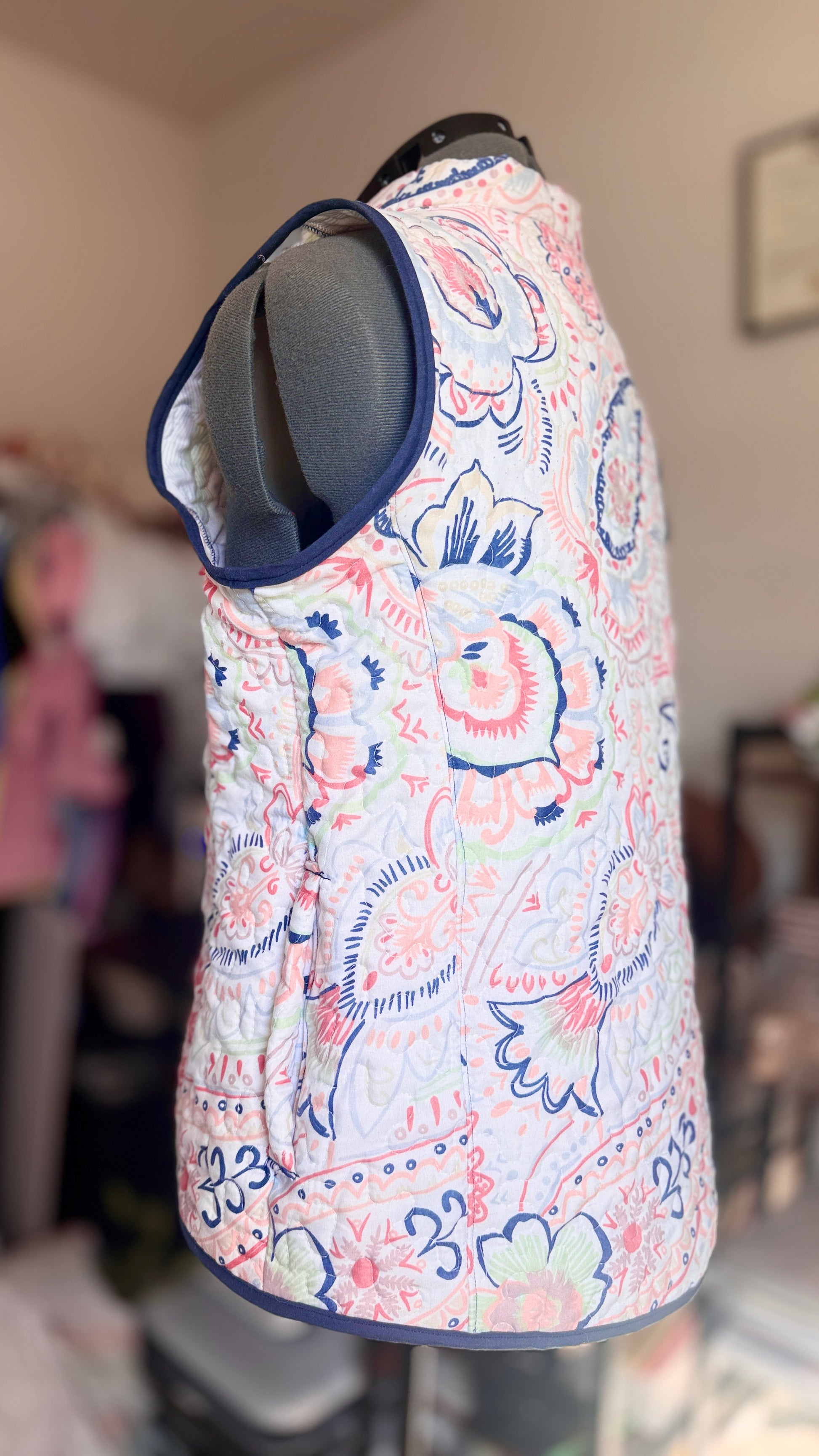 Each stitch tells a story — featuring a colorful, boho-inspired floral and paisley print, front zipper closure with a sturdy metal zip, and deep curved pockets perfect for keeping your hands warm or carrying small essentials. Finished with contrasting navy blue binding for a polished, timeless look, this vest blends sustainability with everyday comfort.